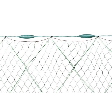 Ce tramail est composé de 3 nappes de filets en nylon polyamide vert, avec une nappe interne en maille de 27 mm, et il est monté directement sur une corde flottante et corde plombée.